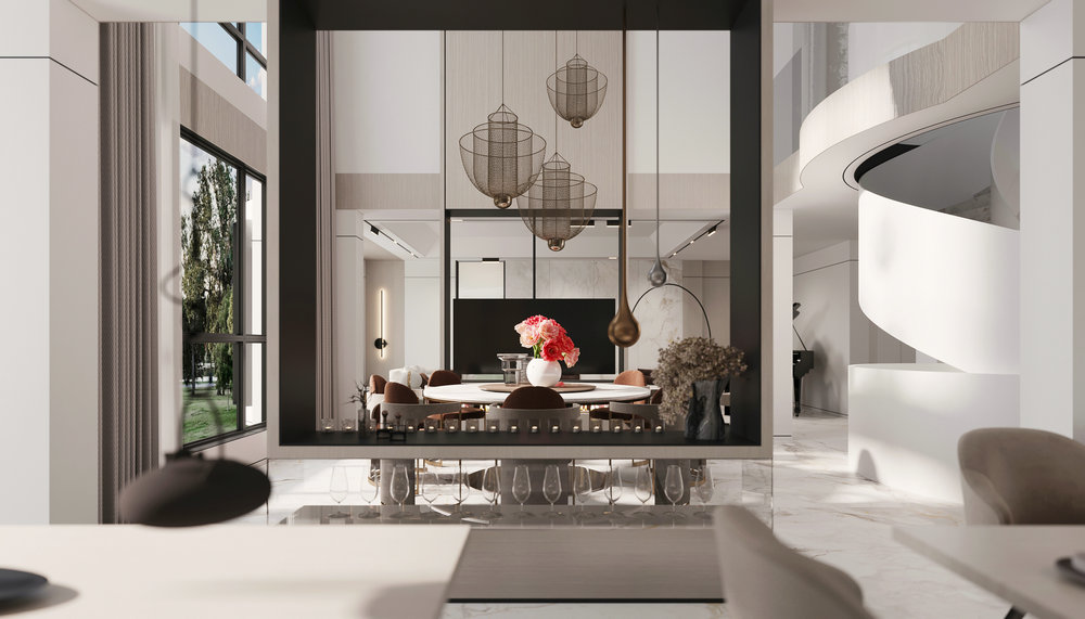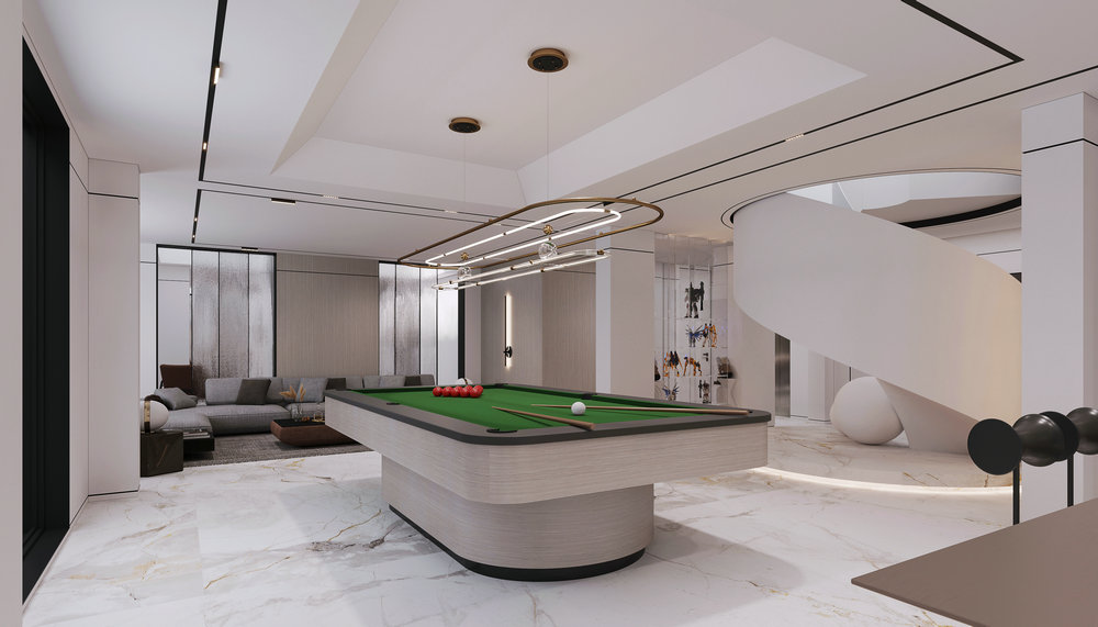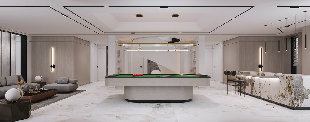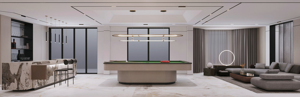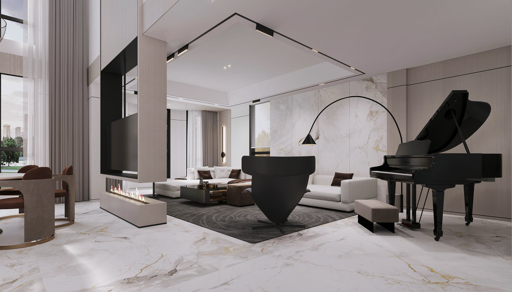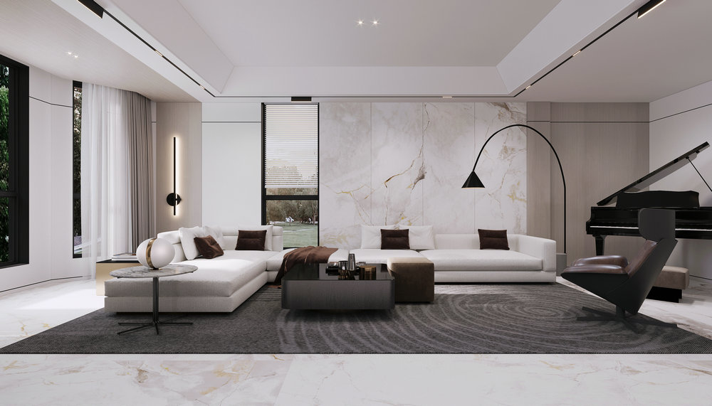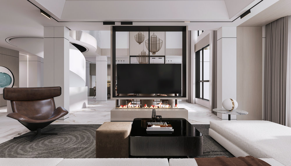 ★设计说明:本空间遵循极简主义理念,布局开放流畅,无多余阻隔,视野开阔。以灰色沙发,白色大理石墙面与木饰面结合,搭配悬挑电视背景使空间简洁中彰显品质,为居住者打造舒适高雅的极简之居。