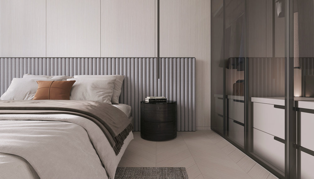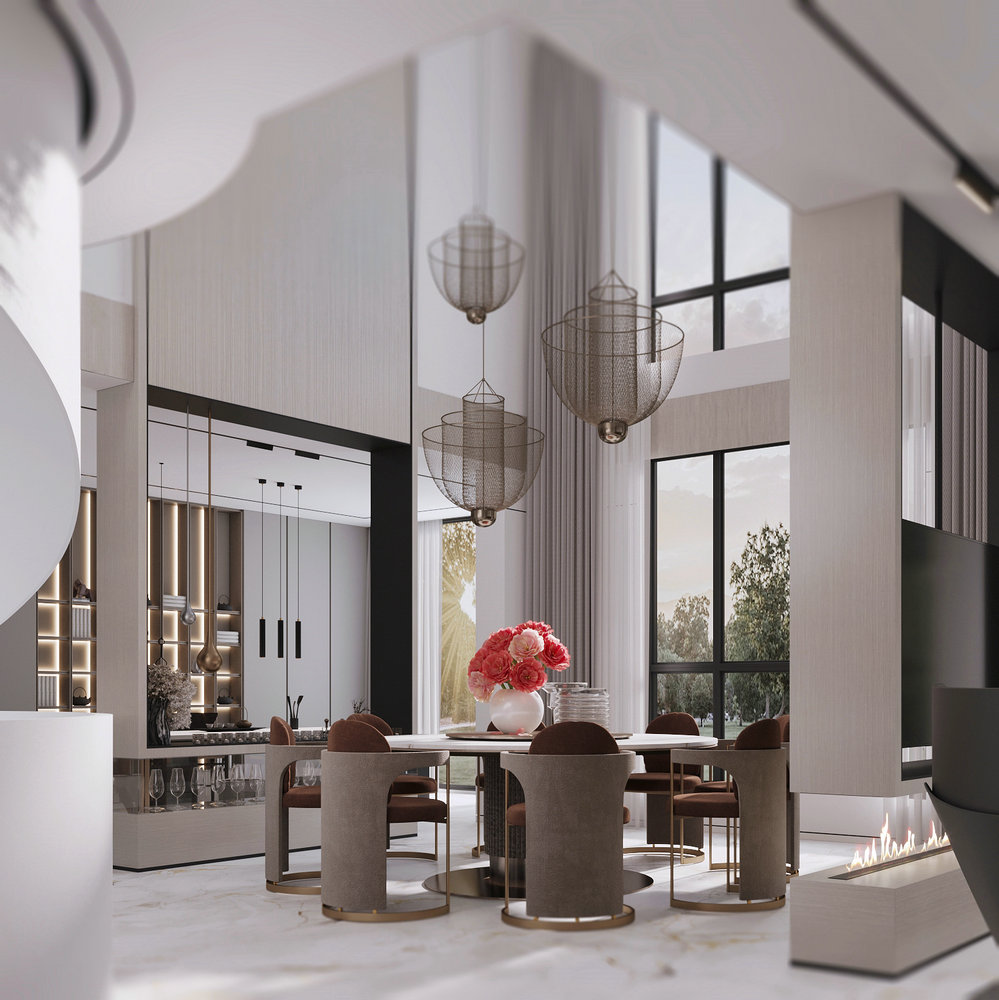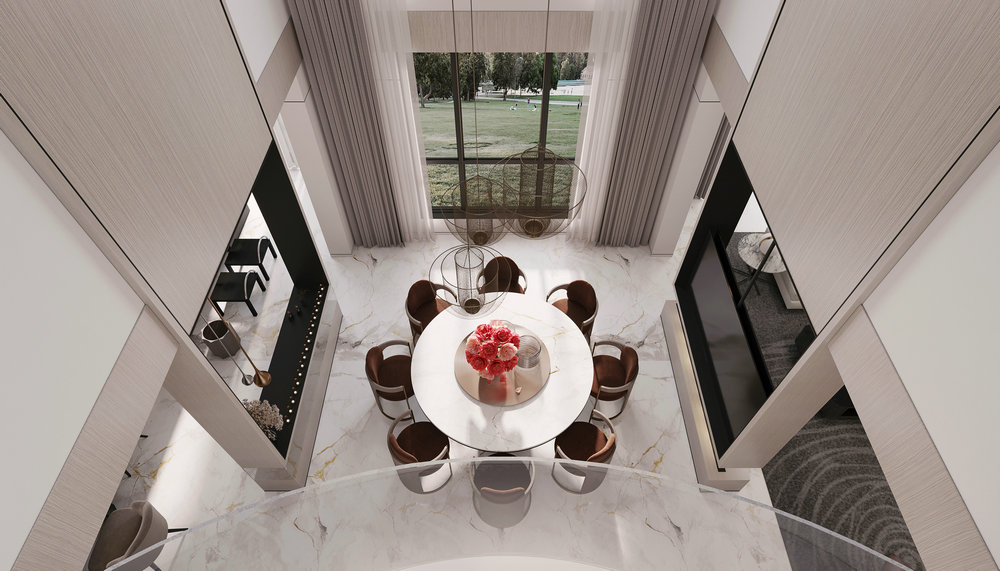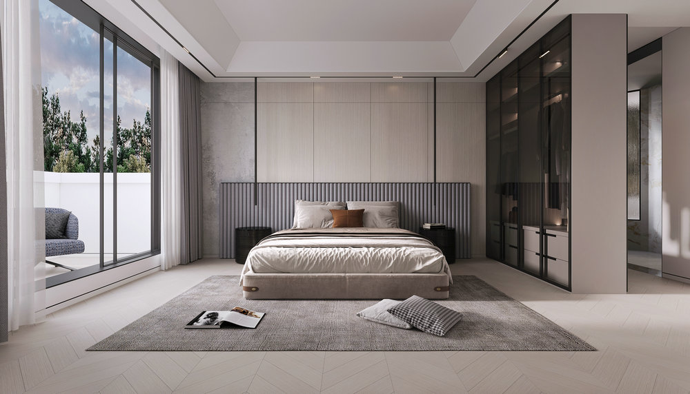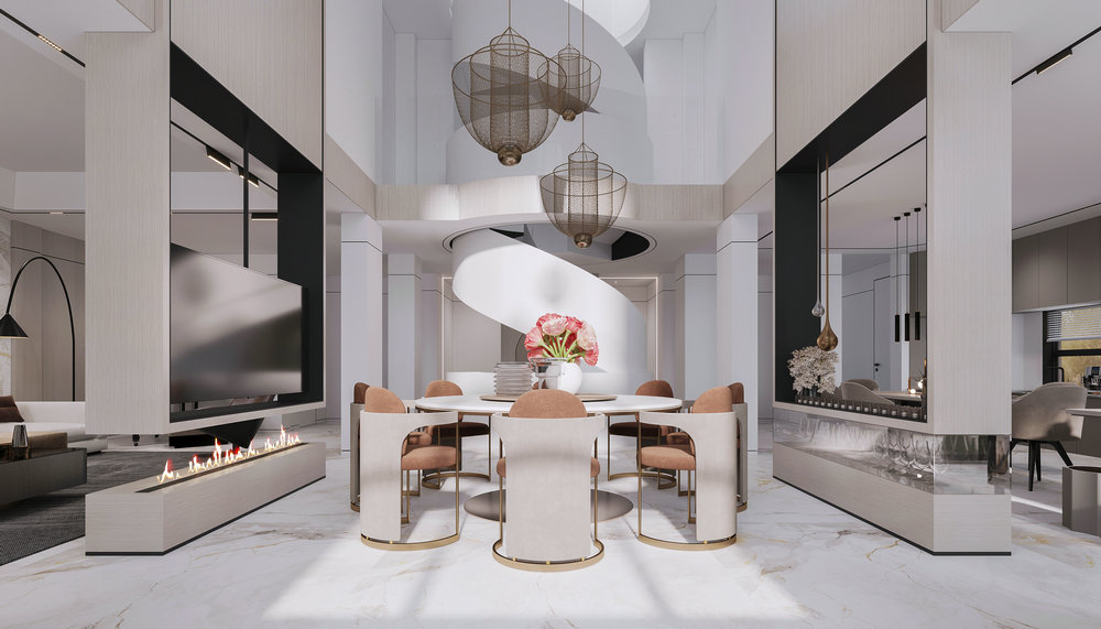 ★设计说明:本空间遵循极简主义理念,布局开放流畅,无多余阻隔,视野开阔。以灰色沙发,白色大理石墙面与木饰面结合,搭配悬挑电视背景使空间简洁中彰显品质,为居住者打造舒适高雅的极简之居。